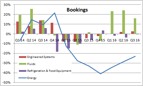 Third, while organic bookings in fluids (see chart above) declined, Dover has been acquiring businesses, and as you can see below, its fluids bookings were up 16% on a reported basis in the third quarter. If oil and gas spending improves, there is also significant upside potential.