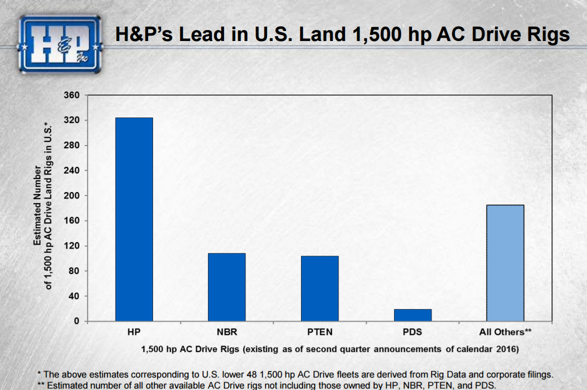 This means two things. One, total drilling activity won't likely be as robust as it was back in 2014, so fewer total rigs will be used, and two, only those companies with fleets of high-specification rigs will do well. Based on that, it would appear that Helmerich & Payne is in the best shape in this regard, with Patterson UTI and Nabors tied for a distant second.