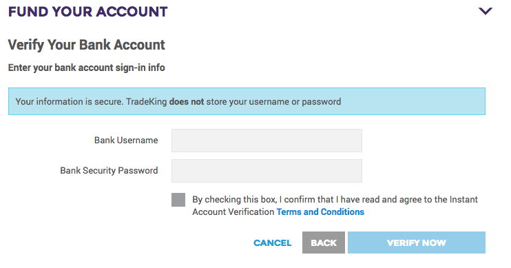 If you choose to fund the brokerage account right away, then you'll be asked for the username and password you use to log in to your bank's website. TradeKing says it needs this information in order to link your bank account with your brokerage account in real time. The company doesn't store your login credentials, but if you feel uncomfortable doing this, you can always fund the account with a check, wire transfer, or another brokerage account. You can learn more about those options on TradeKing's website here.