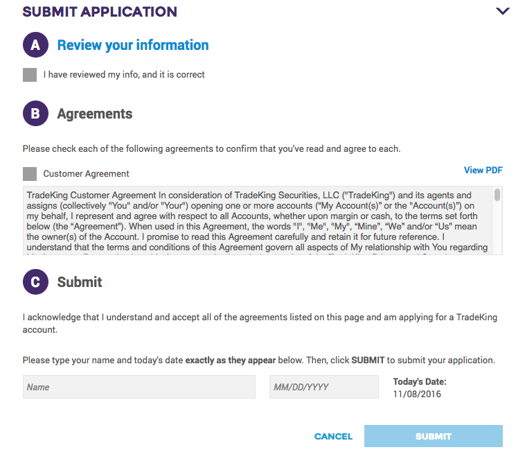 In this section, you'll just be asked to review all the application information you've entered, agree to TradeKing's customer agreement, and then electronically sign your application, date it, and submit it.