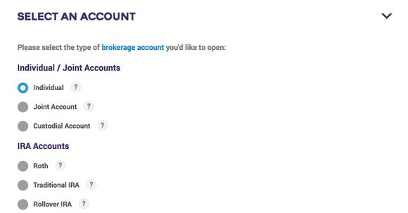 In this section you'll select which type of account you want to open. For this how-to, all of the steps relate to the individual brokerage account.