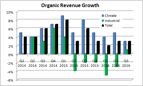 On the other hand, its motley collection of industrial business have seen revenue trending in the other direction. As you can see below, the climate segment has propped up total growth this year.