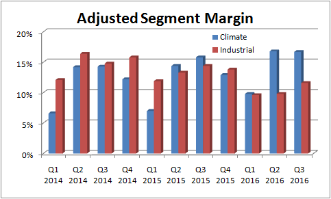 Fourth, management's execution on margins within the climate segment has been excellent: the segment has more than made up for disappointing industrial results, and has led to significant increases in full-year 2016 EPS and free-cash flow. For example, management started the fiscal year forecasting adjusted EPS in the range of $3.80 to $4, but as of the third-quarter management now expects $4.17 to $4.22.