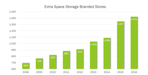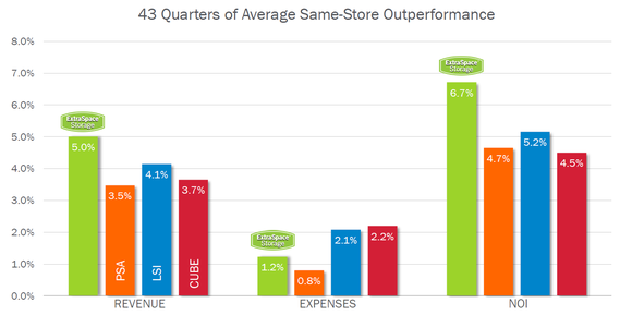 In addition to growth by acquisitions, Extra Space has done a great job of generating more revenue from its existing facilities. As of the most recent quarter, the company has grown its same-store net operating income (NOI) by 7.8% year-over-year, and has outperformed its peers over the long run in terms of revenue growth versus expense increases.
