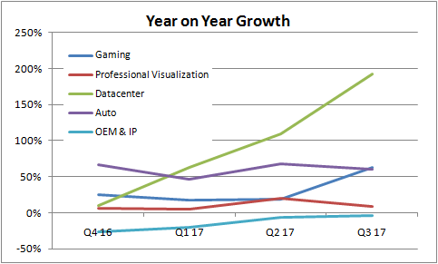 However, a quick look at growth rate by market shows that auto- and data center-based revenue are growing more than gaming. NVIDIA is set to be a leading player in the fast-growing auto-infotainment market, while graphics acceleration in the data center is also a key growth area for NVIDIA.