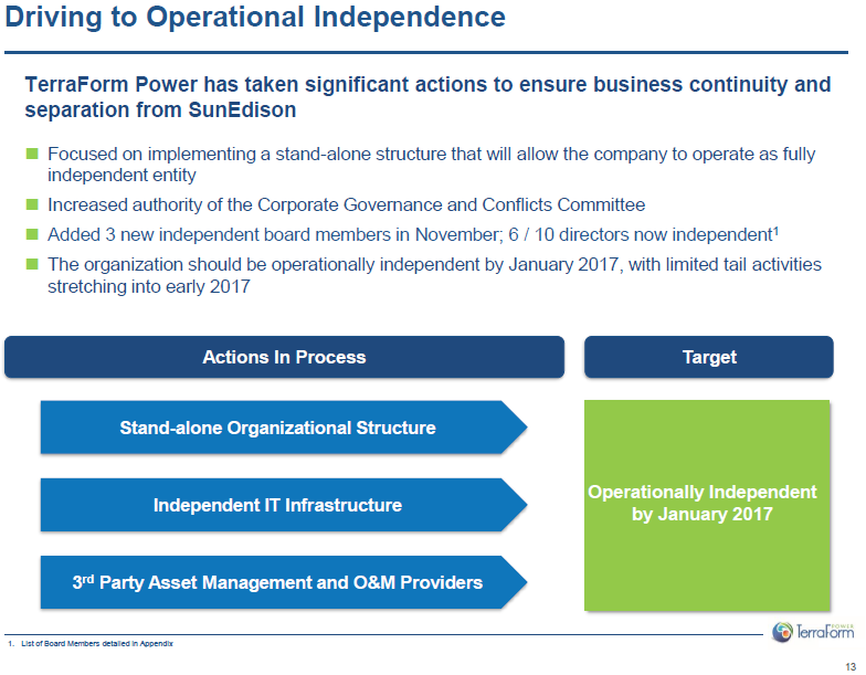 Terraform Power's presentation also highlighted the fact that they are close to achieving complete operational independence from SunEdison. This is expected to occur in January 2017, and includes the implementation of a stand-alone IT infrastructure and a plan to directly employ all key personnel by the beginning of 2017. The company is also bringing on 3rd party service providers for their ongoing project operations and maintenance expenses.