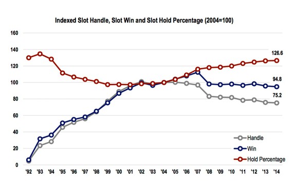 According to a study conducted by Applied Analysis for the Association of Gaming Equipment Manufacturers, since 2007, the national hold percentage from slot machines -- or the portion of money of money gambled that the casino retains -- has increased 6.2%, but the amount of money players bet has fallen by 18% and the amount casinos won from slot players dropped 13%.