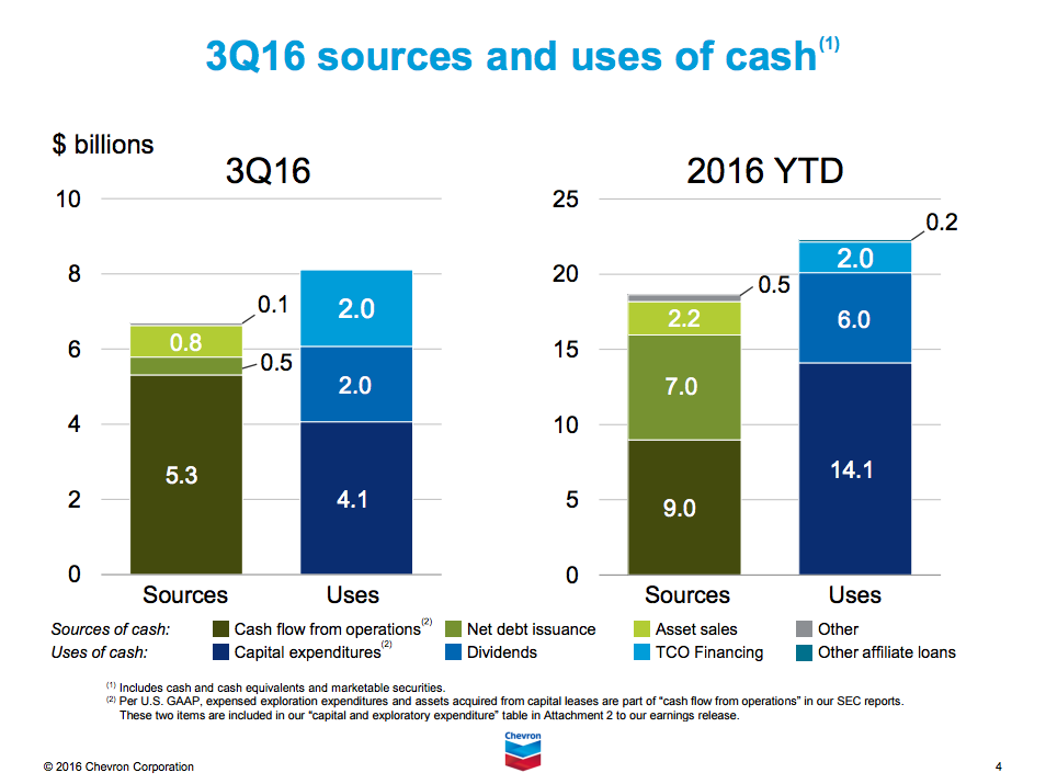 Chevron spent $14 billion on capital expenditures through the first nine months of 2016, way more than the cashflow it is generating. The problem that Chevron faces is that there's a finite amount of oil in its reserve base. Every barrel it pulls out of the ground has to be replaced or the company risks eventually running out of oil to drill for. In other words, it just can't stop exploring and developing new sources of oil and gas, it's a key part of the business model.