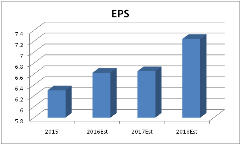 The following chart shows analysts' forecasts for EPS in the next few years. For reference, the forecast compound annual growth rate from 2015 to 2018 is a paltry-looking 4.7%.