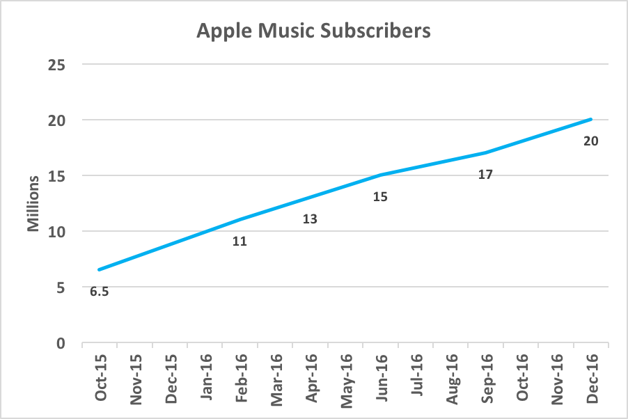 The latest data point comes from Billboard, which recently interviewed services chief Eddy Cue and Beats 1 DJ Zane Lowe. Apple Music has now hit 20 million subscribers, according to the report. At $120 per year, we're now talking about an annual run rate of $2.4 billion for Apple Music.