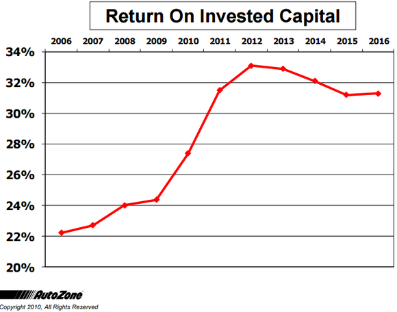 Another focus of management has been to improve return on invested capital (ROIC), and while it's declined slightly from its peak, it still hovers near all-time highs. AutoZone has been cautious with its new strategies, such as its mega hub stores and more frequent inventory replenishment, and that combined with surging net income sets the stage for stable ROIC going forward.