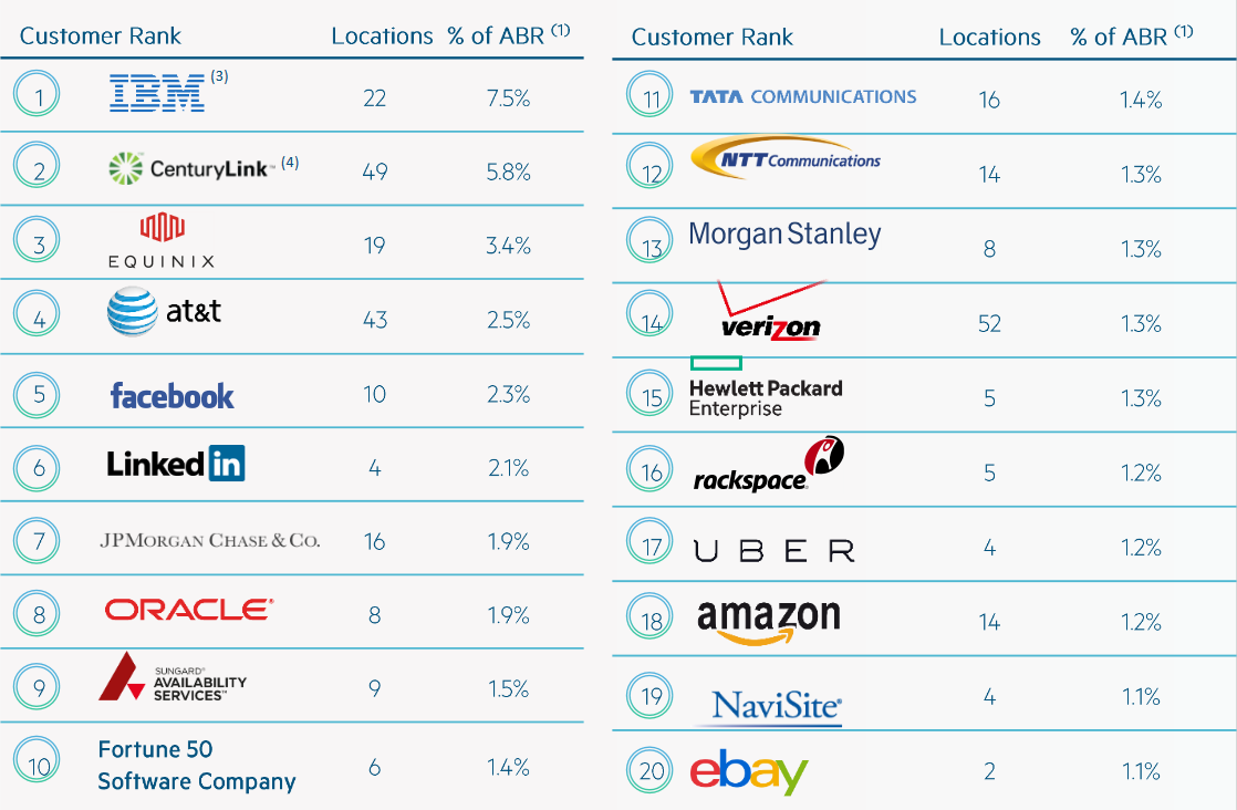As of the end of 2016's third quarter, Digital Realty had 144 properties consisting of 25 million rentable square feet, and is the 12th-largest publicly traded REIT in the U.S. It leases its data center space to more than 2,000 customers, including major tenants like Facebook, IBM, LinkedIn, AT&T, and JPMorgan Chase, just to name a few. Digital Realty's top 20 customers account for 42.7% of its rental income, with no single tenant generating more than 7.5%.