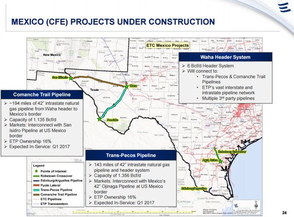 Energy Transfer initially expected to complete construction on the Bakken System by the end of 2016, but that's no longer possible. At best, the company might be able to finish the project in the first quarter of next year, assuming it gets the necessary permits. Because of that delay, the next project to go into service for the company could be its Trans-Pecos and Comanche Trail Pipelines, which will take gas from Texas to Mexico: