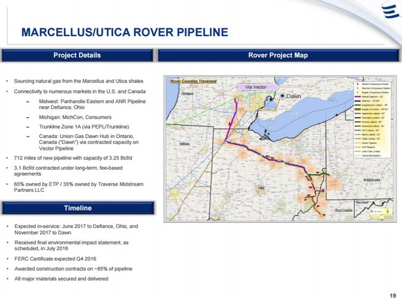 As that slide notes, Rover is a two-stage project, with the first phase scheduled to be in service by June, and the second leg in November. Because of that, the company will start collecting some of the fee-based income in the second half of the year. Given the size of the project and Energy Transfer's significant stake, this will be a meaningful contributor to results going forward.