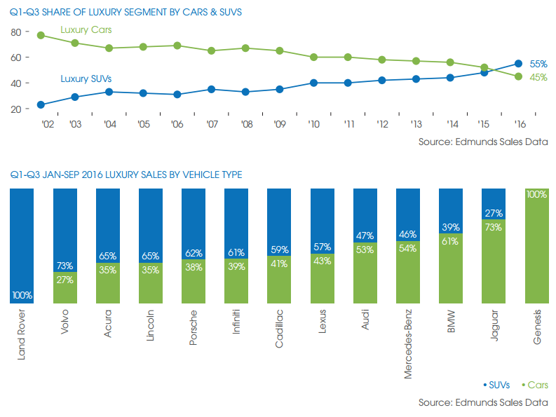 According to data tracked by Edmunds.com, that appears to be the case. Here's a look at how luxury SUVs vs. luxury cars have trended, and which brands are ahead of the curve in offering more luxury SUV sales.