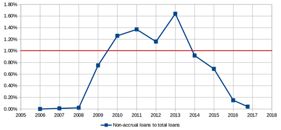 Prior to the recession, Bank of Marin had an excellent loan approval process. This resulted in an extremely low percentage of non-performing loans, or NPLs, even during the financial crisis. As I recently explained in an article on Sierra Bancorp , another small California bank, NPL percentage can be used to judge a bank's asset quality. Low percentages of NPLs indicate high-quality assets, and, by extension, a good loan approval process. Bank of Marin has that in spades: