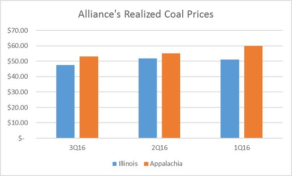 That's not to say Alliance has no upside to rising prices in the future. The company does have about 20% of its 2017 capacity currently uncontracted, which provides some upside to higher prices next year. Further, the company has idled several mines over the past year to limit production by matching it with firm coal contracts. Alliance could bring this idled capacity back online to capture rising prices. While that would take some time, and would likely only happen if the company had enough firm contracts to justify the expenses needed to bring this capacity back online, it does provide some optionality.