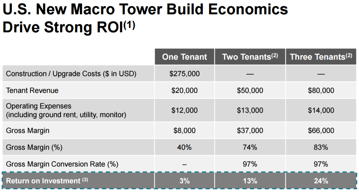 American Tower's business is owning and leasing space on wireless towers to telecommunications companies. For many telecom companies, it's not that lucrative to own the land and the tower to hold its equipment alone. American Tower, on the other hand, can lease out space on the same tower to multiple clients. Each time it is able to add multiple clients to a single tower, it drastically improves the rate of return on those assets, as the company shows in a sample from its investor presentation.
