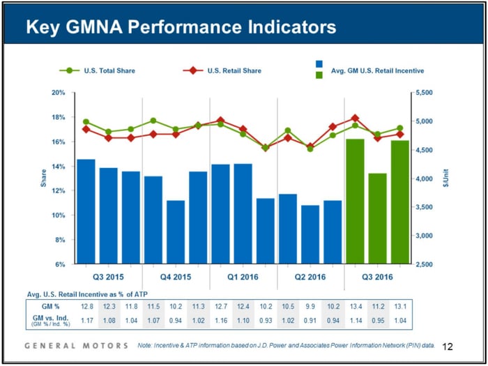 Initially, GM believed incentives would relax during the fourth quarter, but that doesn't appear to be the case. For instance, during November, GM's incentive spending as a percentage of ATP was 13.7%, above the industry average of 12.4% -- a wider gap than its full-year 11.7% incentive to ATP, compared to the industry's 11.4%.