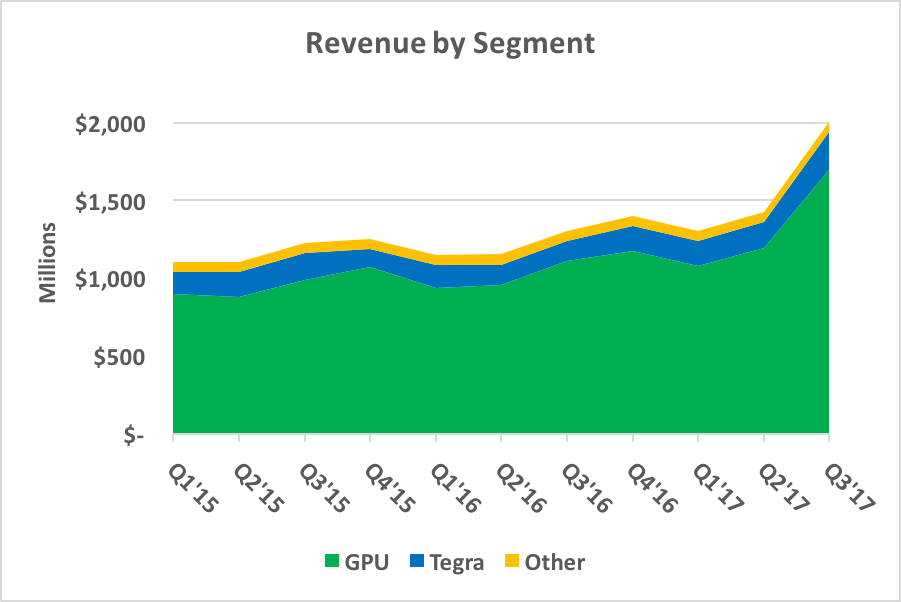 For starters, let's acknowledge why NVIDIA has been having such a blockbuster year. Simply put, the company is absolutely firing on all cylinders, including its core GPU business as well as numerous initiatives that it has been investing in over the years, particularly automotive and data centers. NVIDIA's Tegra business had been floundering for a while, but its recent recovery has been nothing short of stunning as NVIDIA has been able to successfully pivot the mobile processor to other applications and markets -- namely, automotive.