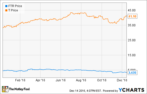 As the preceding chart showed, AT&T stock has been trending up while Frontier's has been inching down. Frontier opened the year at $4.60 and closed on December 14 at $3.44, a 25% drop. AT&T opened 2016 at $34.08 before closing on Dec. 14 at $41.11, a 20% gain.