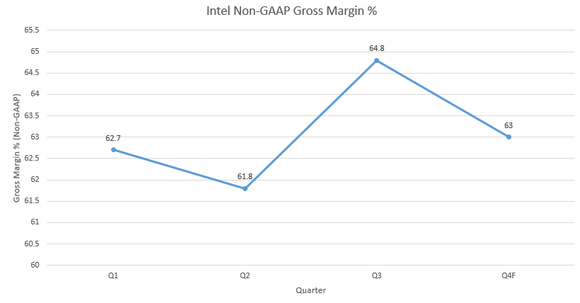 Intel has said that its long-term gross profit margin percentage goal is between 55% and 65%. Over the past three quarters, on a non-GAAP basis, Intel's gross profit margin percentage has been running near the high end of that range: