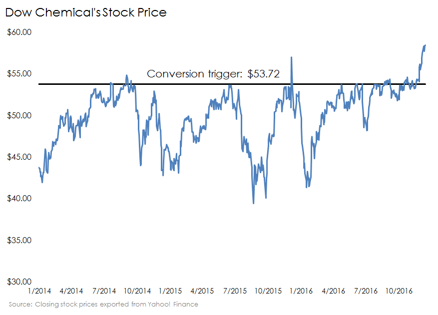 Dow really wants to pay off this preferred stock. To do so, it needs its share price to trade above the $53.72 threshold.