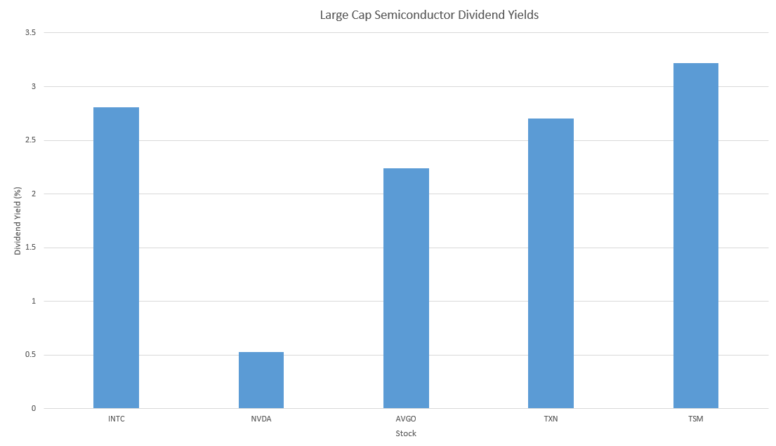 Microprocessor giant Intel (INTC 4.33%) pays a solid dividend of $1.04/share on an annual basis. As of a recent check of the stock price, that works out to around 2.81% yield. Although the company is far from high-yielding in absolute terms, it's solid relative to what its large-cap, dividend-paying semiconductor peers pay.