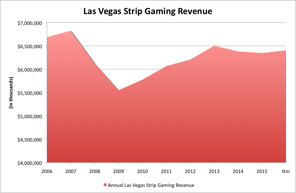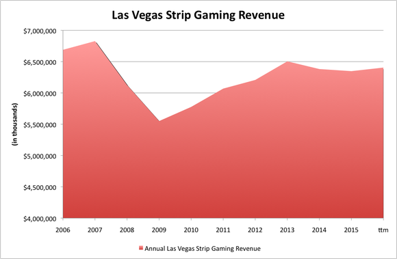 Below is a chart of the Las Vegas Strip's gaming revenue since 2006, and you can see that gaming revenue has been flat-ish for about a decade. But in 2013, when plans for expansion began, it looked like Las Vegas may be growing again.