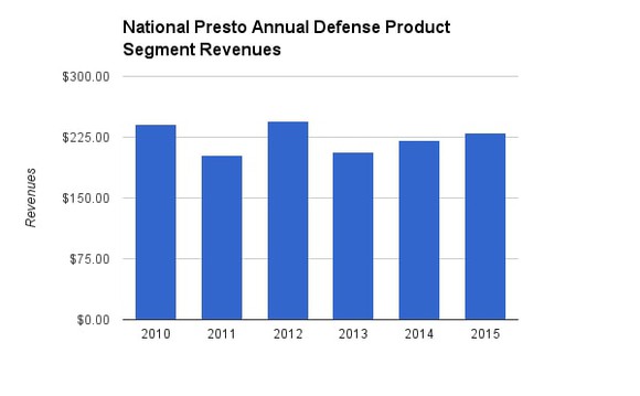 Although pressure cookers, skillets, griddles, and waffle makers may be the first things you think of when considering National Presto, it actually derives more revenue from its government defense contracts than it does from its kitchen gadgets by a better than two-to-one margin. Over the first nine months of 2016, National Presto's defense segment generated $145.6 million while housewares saw just $64.4 million in sales. (Its adult diaper business realized another $57.6 million.)