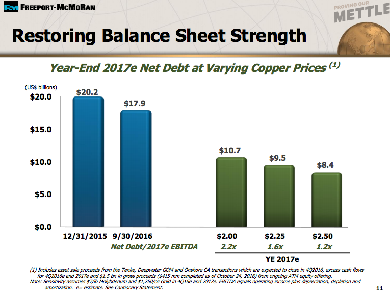 The second big driver is that Freeport is finally starting to gain some traction in its efforts to deal with an ill-timed, and debt-laden, investment in oil. That has included success in selling off some oil assets and putting cash from asset divestitures and stock sales toward paring down its debt. Freeport has made huge strides on the debt front and expects to be able to cut its net debt in half by the end of 2017 from 2015 levels, assuming copper prices hold at around $2 a pound. The company's average realized price for copper was $2.18 per pound in the third quarter.