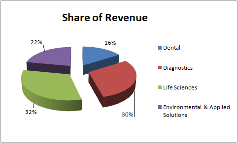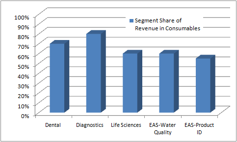 As illustrated below, Danaher has a high portion of its revenue (overall 65%) coming from consumables, granting it relatively stable revenue streams.