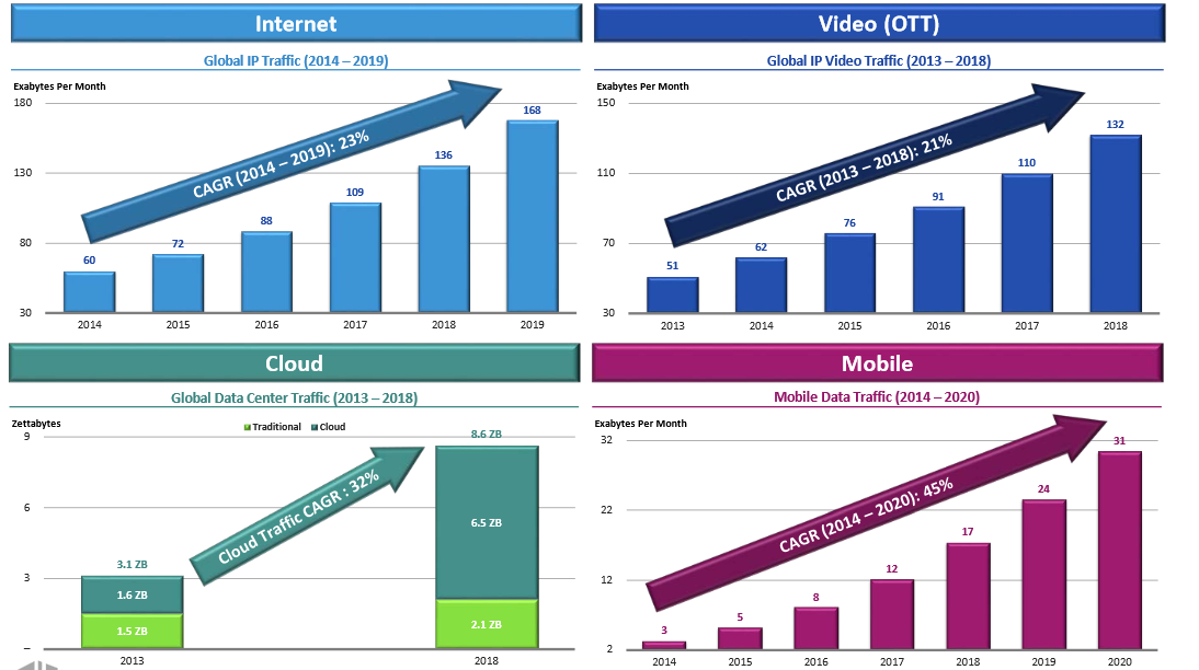 Here's why I say there could be more rapid growth ahead. Through 2019, data center IP traffic and cloud IP traffic are projected to roughly double, and mobile data traffic is expected to grow even faster, according to projections from Cisco.