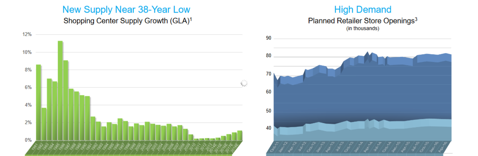 In addition, the market fundamentals look good for shopping centers. New supply has been near a historic low for several years now, while demand for new retail stores for the next couple of years is rising.