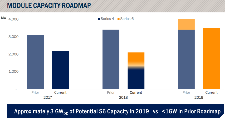 Management has said they expect panel efficiency to be over 18% by the time Series 6 is up and running, but at the same time Chinese manufacturers will be ramping up mono-PERC technology, which will have efficiencies in the high teens. First Solar may just be keeping up by moving to Series 6 rather than creating differentiation.