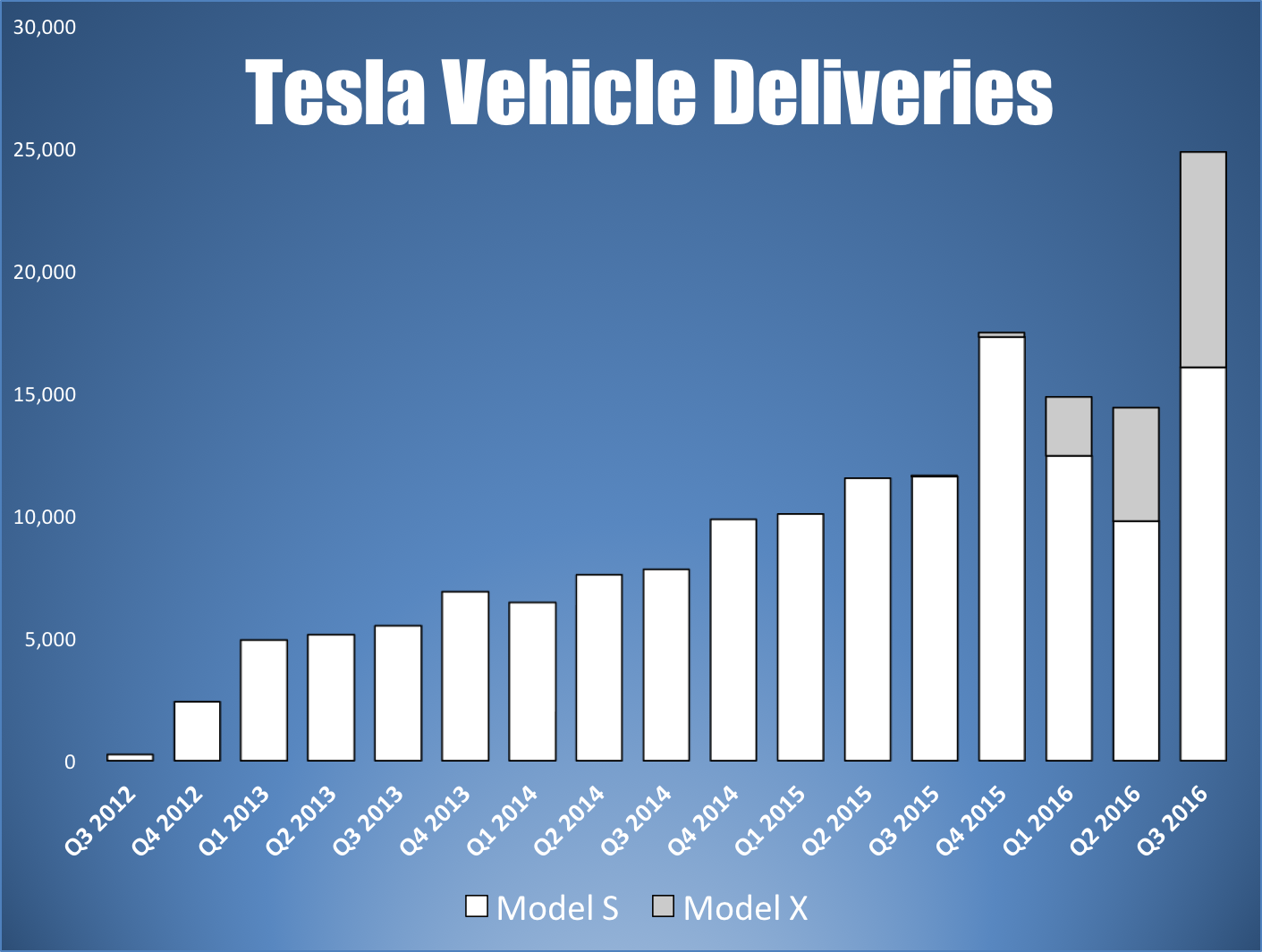 In its third quarter, Tesla reported surprising growth in vehicle deliveries. Vehicles deliveries soared 114% year over year and 72% sequentially thanks to a sequential rebound in Model S deliveries and a continued production ramp-up of the company's late-2015 launched Model X SUV.