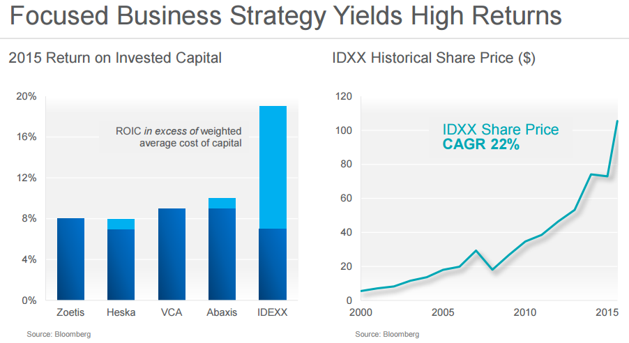 One of the most impressive metrics from IDEXX Labs is its sustainable recurring revenue. In 2010, 81% of total IDEXX revenue was recurring, and that's only increased in the following years, reaching 87% in 2015. The company's heavy spending on research and development helps fuel innovation, which has helped generate strong return on invested capital -- and has sent its stock price soaring.