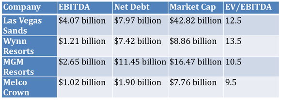 One of the best ways to measure a gaming company's value is by comparing enterprise value (net debt plus market cap) to EBITDA, a measure for cash flow coming from a resort. The figures for these four companies can be seen below.