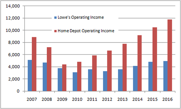 Third, strong ongoing return on invested capital means both companies should be able to reinvest their cash flows in order to generate growth, provided the home improvement market grows.