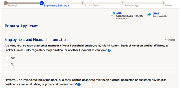 In this section Merrill Edge will ask you if you or your spouse, or another member of your household, is employed by Merrill Lynch, Bank of America and its affiliates, a broker dealer, a self-regulatory organization, or another financial institution listed.