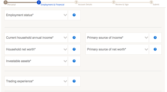 You'll also be asked for your employment status, and you'll have to give details about your employer (if applicable). You'll answer questions about your annual income, primary source of income, household net worth, primary source of net worth, and investable assets. If you're unsure what any of these categories mean, just click on the blue question mark next to the question box. Lastly, you'll be asked one simple question about your trading experience level.