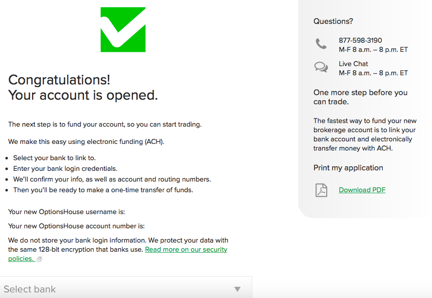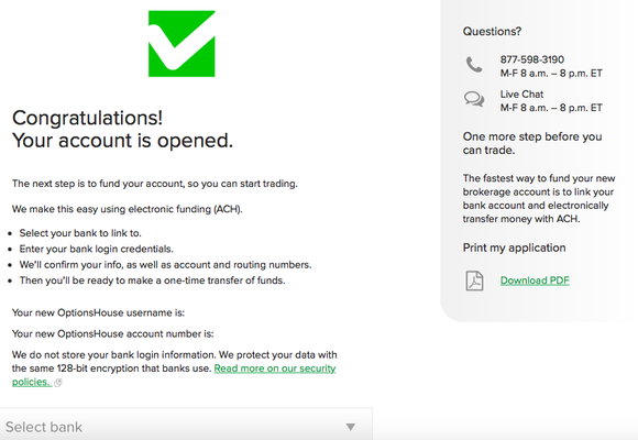 You'll then be taken to a page informing you that your account is now open and providing instructions for how to fund it. This page will also show you the username that you created at the beginning of the application process, along with your OptionsHouse account number.