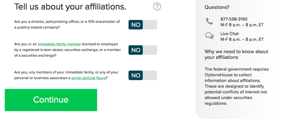 The federal government requires all brokerages to ask these questions to help identify any potential conflicts of interest. You'll likely answer "no" to all of these questions, and then you can head on to the next section.