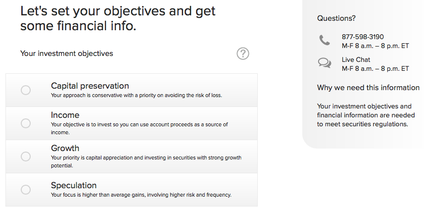 In this section you'll select your investment objectives (capital preservation, income, growth, or speculation). You'll also select whether or not you have any experience with options trading and list your investment experience (i.e., years of trading and average trades per year).