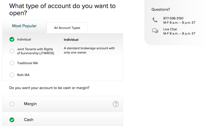 In this section you'll select which account you want to open and choose some of the account features. For this how-to we're opening up an individual brokerage account.