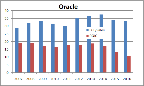 Finally, a quick look at FCF/sales suggests Oracle is holding up well during the transition, but declines in operating income in the last two years have hit ROIC. No matter, if EPS bounces back to 9% growth as expected in the year ending May 2018, the stock will start to look very cheap.