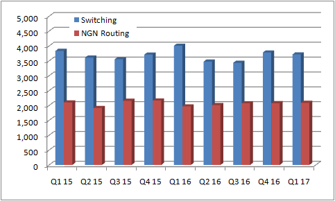 Similarly, if Cisco's routers and switches (which generate around 45% of its revenue) become commoditized, then less expensive options from competitors like Huawei or ZTE could threaten Cisco's market position. Indeed, a look at its quarterly switching and routing revenues shows that combined switching and routing revenue growth has been negative for the last four quarters.