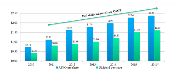 But perhaps most important, the company's dividend is healthy and sustainable. Instead of free cash flow, the best measure of this is adjusted funds from operations (AFFO). As you can see below, AFFO has steadily grown over time, but there's still a lot of wiggle room for the dividend.