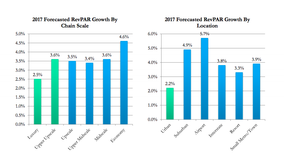 Indeed, as you can see below, RevPAR in luxury and upper upscale hotels in urban areas is predicted to be the slowest-growing segment of the industry, which is causing a fair deal of anxiety among investors.
