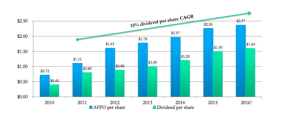 Over the past 12 months, the company has needed to use only 67% of AFFO to pay its dividend. This not only means that the dividend should continue to grow for the foreseeable future, but that if the company needs to spend on upgrades at existing locations, it has the availability of cash to make that happen.